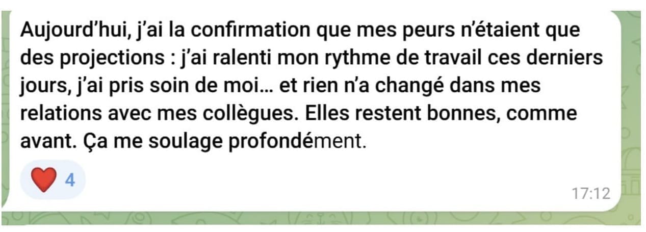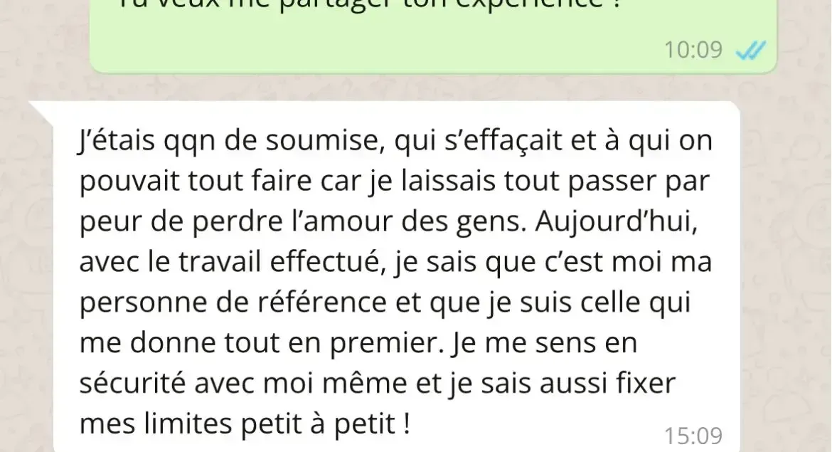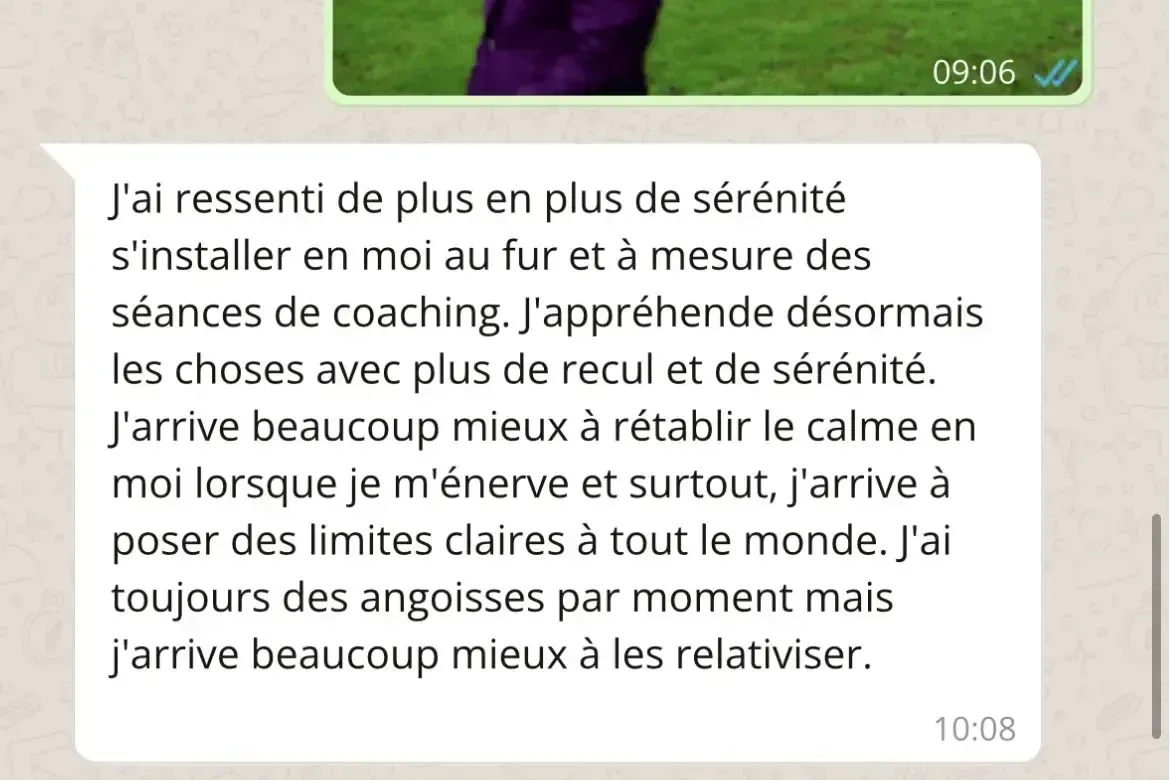 des limites que tu poses sans exploser ni culpabiliser et une capacité à faire autrement, même dans les situations qui te déclenchaient avant.