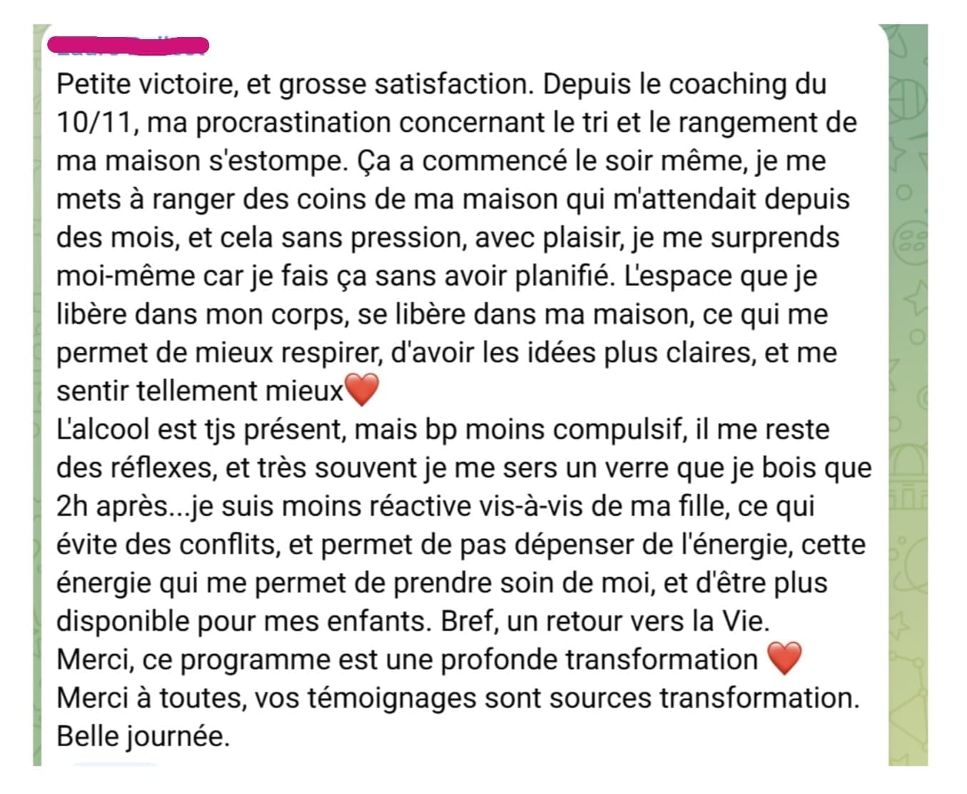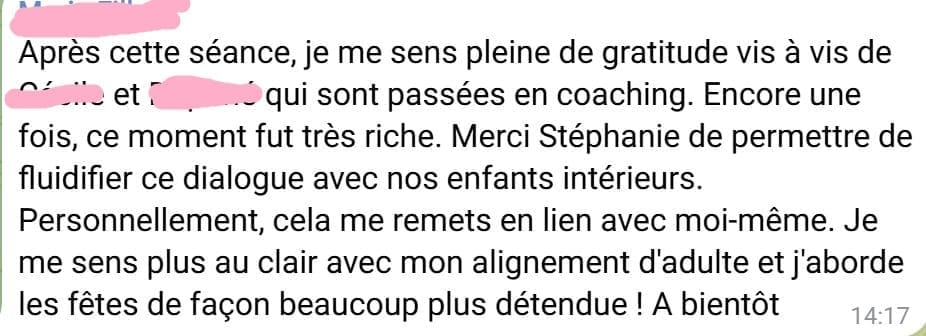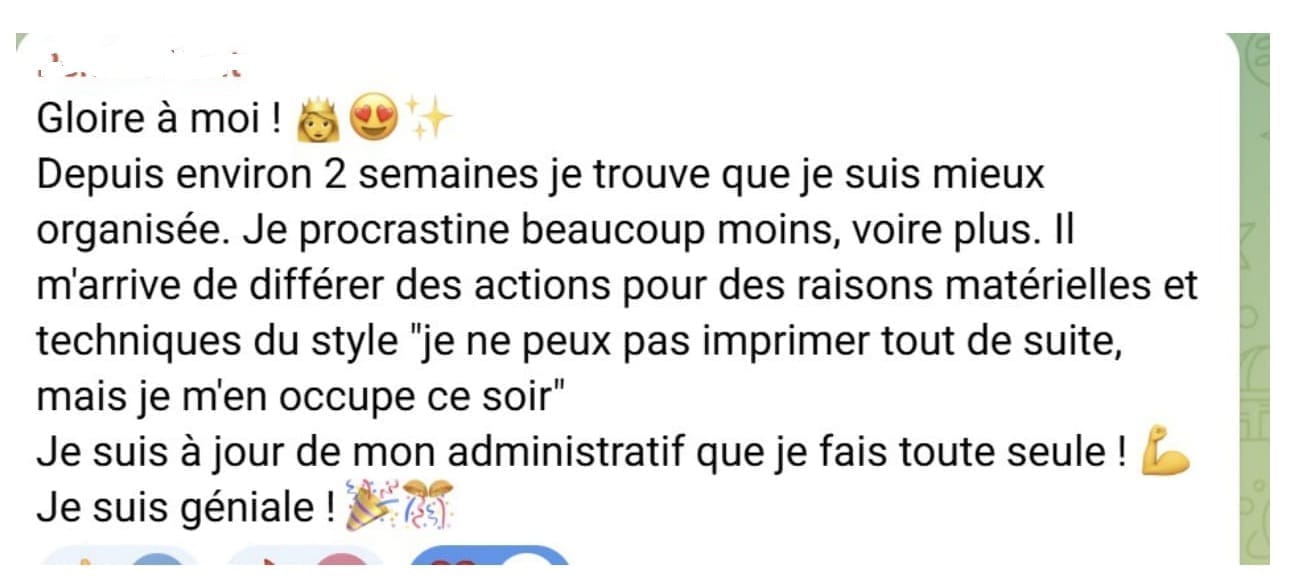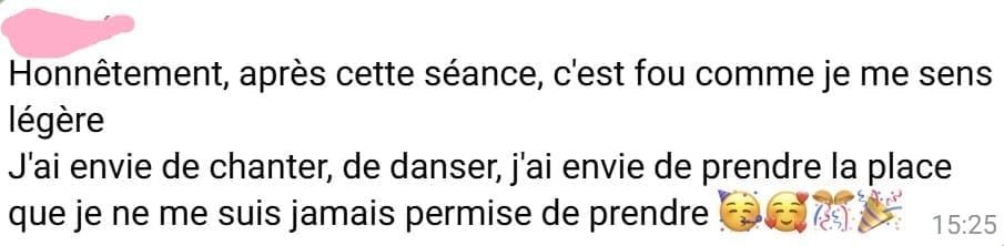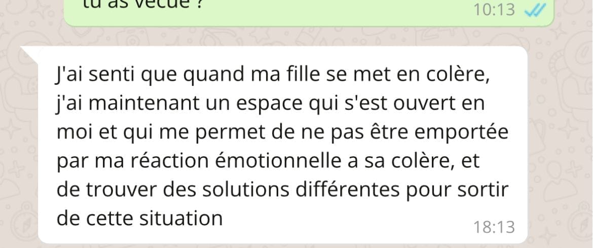 En quelques semaines, mes clientes passent de réactions qu’elles subissent à des réponses qu’elles choisissent avec des changements visibles dès le premier mois dans leur quotidien (moins de conflits, moins de culpabilité, plus de clarté dans leurs réactions).